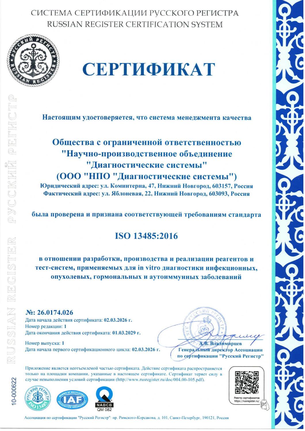 Сертификат СМК в соответствии с ISO 13485 в отношении разработки, производства и реализации реагентов и тест-систем, применяемых для ин витро диагностики инфекционных, опухолевых, гормональных и аутоиммунных заболеваний