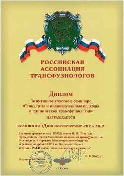 Участие нашей компании в семинаре было отмечено дипломом Российской ассоциации трансфузиологов.